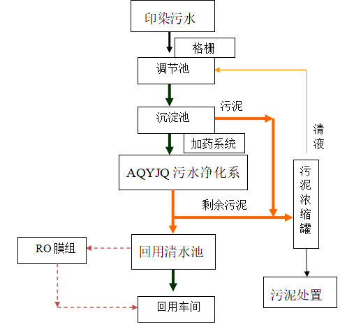 由于印染行业的污水杂质非常多,且色度高成分复杂,该项目必须经过前处理,将大部分容易沉淀的颗粒及杂质快速分离,避免水体加速变质。处理目标是将已初步经过前处理的污水通过AQYJQ污水净化技术系统后彻底去除污水中的各类杂质,经过处理后的水清澈透亮、无悬浮物以及色度较低,直接作为合格的工艺生产水从而达到循环回用。考虑到污水处理后长时间的回用可能会引起盐分的累积问题,同时对一些工艺用水的特殊要求,我们增加RO膜组,一方面为了防止长时间回用水的盐分累积问题,另一方面对于某些工艺用水的高要求,通过膜处理后确保用水的水质问题。因此膜组可以根据开机运行后的实际情况选择性的开。
